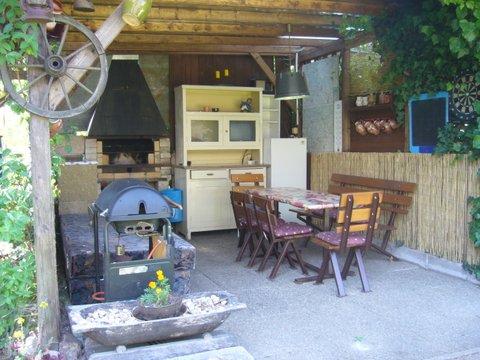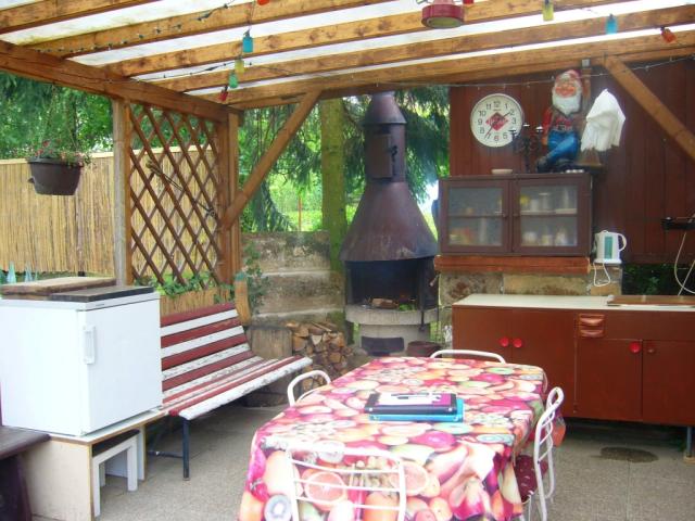 ohniště ano, zahradní nábytek plastový, zahradní sprcha, badminton, ruské kuželky, petang, elektronické šipky, krbová kamna (obývací pokoj), gril plynový, posezení pod pergolou, slunečník, lehátka 4x, krb zahradní
