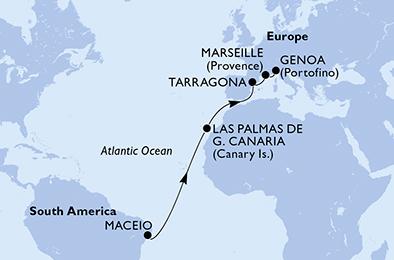 | 1. den,Maceio, Brazílie, (připlutí: --:-- | odplutí: 16:00)2. den,Relaxační den na moři3. den,Relaxační den na moři4. den,Relaxační den na moři5. den,Relaxační den na moři6. den,Relaxační den na moři7. den,Relaxační den na moři8. den,Las Palmas, Gran Canaria, (připlutí: 07:00 | odplutí: 17:00)9. den,Relaxační den na moři10. den,Relaxační den na moři11. den,Tarragona, Španělsko, (připlutí: 09:00 | odplutí: 18:00)12. den,Marseille, Francie, (připlutí: 08:00 | odplutí: 17:00)13. den,Janov, Itálie, (připlutí: 08:00 | odplutí: --:--) |