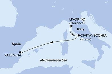 1. den,Livorno, Itálie, (připlutí: --:-- | odplutí: 20:00)2. den,Civitavecchia, Itálie, (připlutí: 07:00 | odplutí: 19:00)3. den,Relaxační den na moři4. den,Valencie, Španělsko, (připlutí: 07:00 | odplutí: --:--)